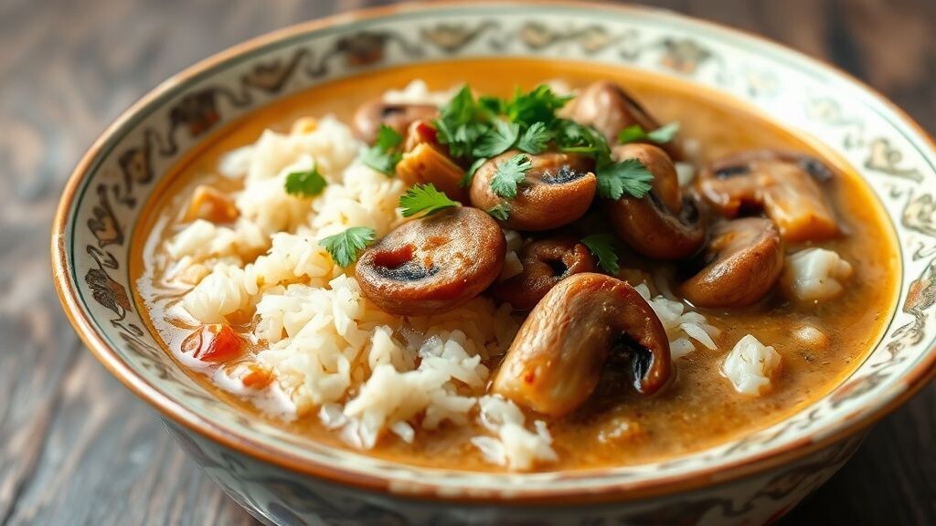 Суп грибной с рисом - это традиционное блюдо, которое объединяет насыщенный аромат лесных грибов с нежной текстурой риса. Суп обладает насыщенным вкусом и высокой питательностью благодаря использованию сушеных белых грибов, придающих бульону глубокий грибной вкус. Нежная обжарка репчатого лука на топленом масле добавляет блюду мягкость и аромат, а свежая петрушка и кинза придают ему свежесть и яркость. Этот суп идеально подходит для семейного обеда или ужина, особенно в холодное время года.