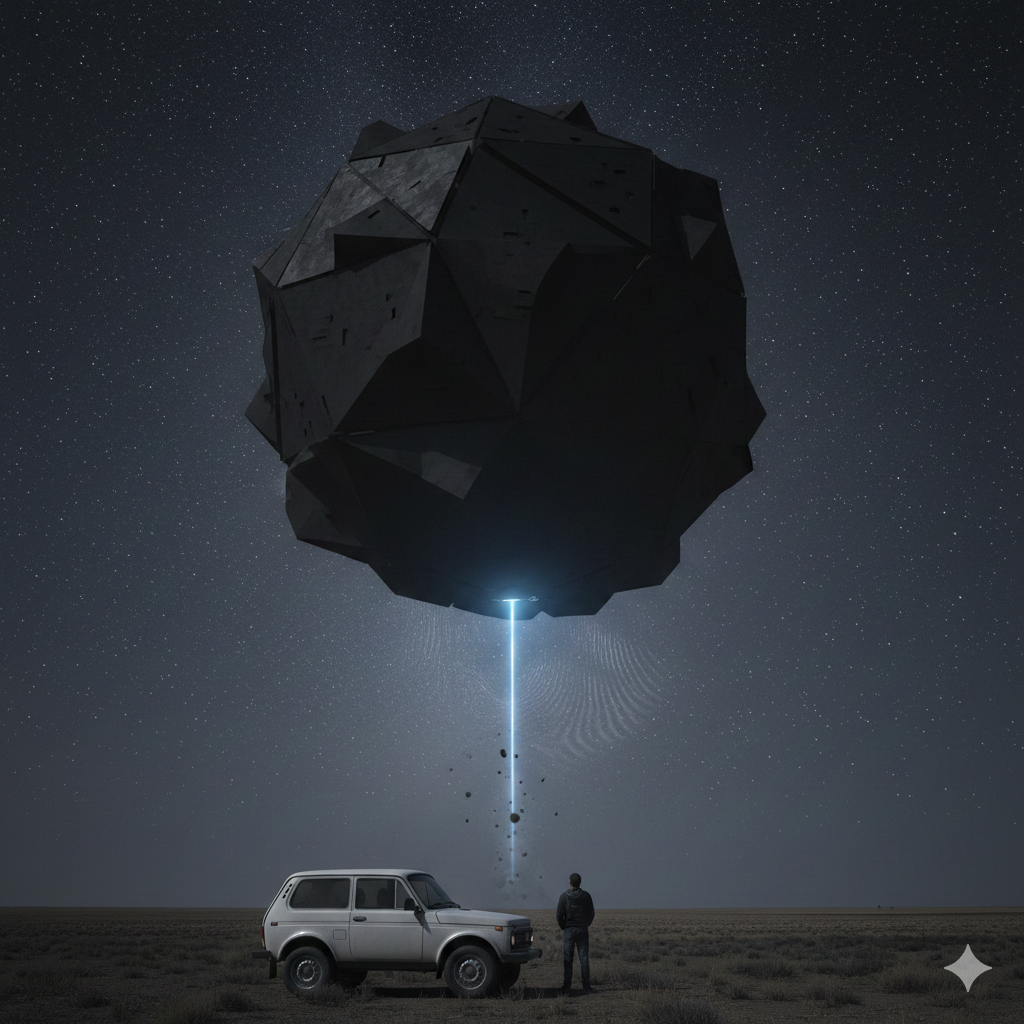 Над ним, закрывая собой звёзды, висел объект. Он не был похож на тарелку из кино. Это был гигантский, матовый геометрический многогранник, напоминающий кусок антрацита. От него не исходило света, но воздух вокруг него искажался, как над раскаленным асфальтом.