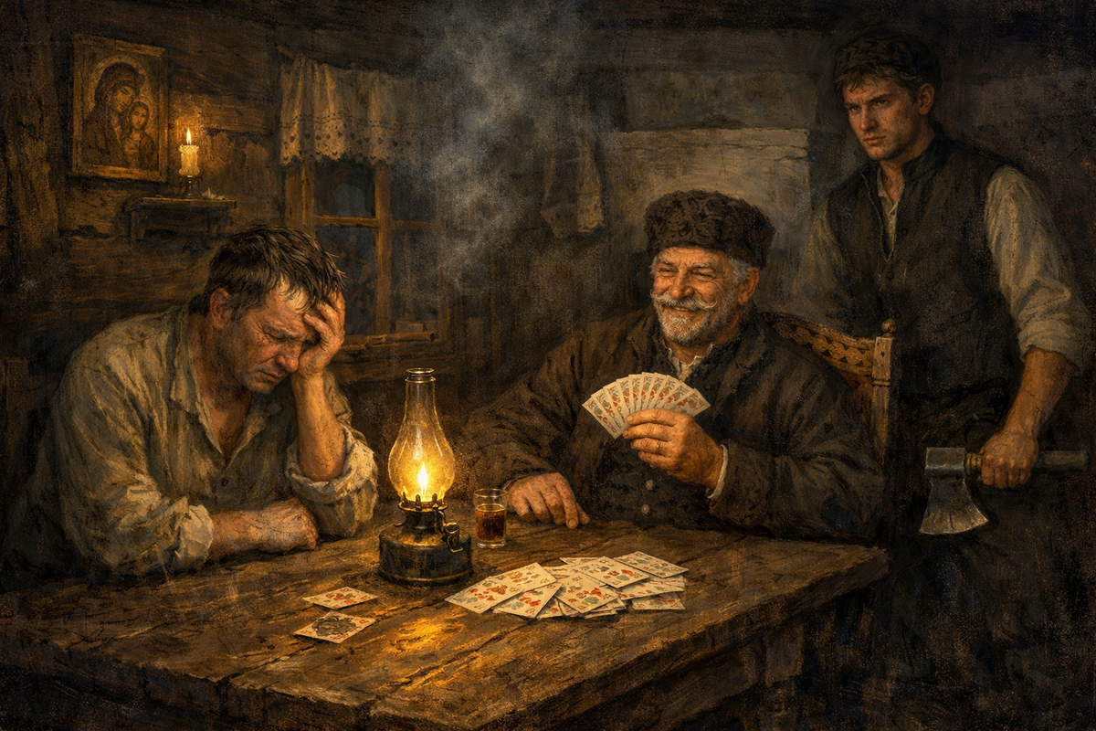 В углу, у печи, стоял Егор. Он не присаживался весь вечер. Сначала думал: отец остановит эту мерзость, не даст соседу довести игру до края. Потом понял: не остановит. Никифор умеет только два дела — просить и злиться. И оба — на тех, кто слабее.