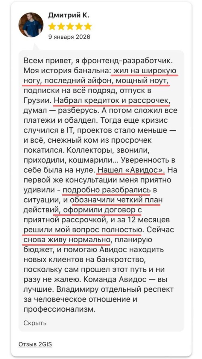 : работа есть, платежи по кредитам посильные, жизнь идёт. Так было и у Дмитрия: покупал то, что нравилось, платил по кредитам, которые не казались обременительными. Но однажды он сложил все цифры и понял: стабильность оказалась хрупкой. Просрочек ещё не было, но финансовое равновесие уже нарушилось. Дмитрий обратился к нам в этот переломный момент. Мы детально разобрали его ситуацию, сформировали понятную правовую позицию и довели процесс до желаемого результата. Теперь он снова уверенно управляет своей жизнью. И мы точно знаем: важно действовать тогда, когда кажется, что ещё можно потерпеть — это и есть лучший момент для решения. АВИДОС | Юридическая ясность в сложных ситуациях