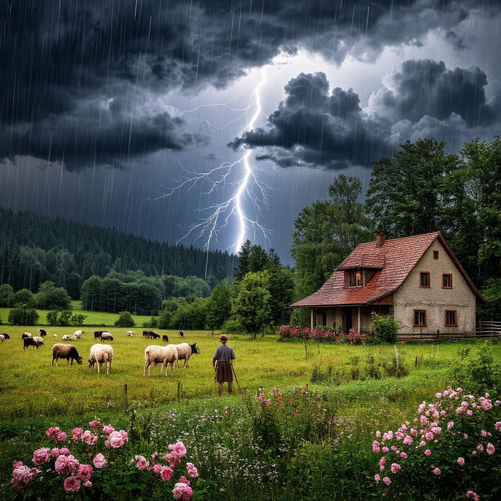 Описание работы: На небе тучи, бушует гроза, сверкают молнии, на поле пастух и стадо, домик в саду. Работа создана с помощью нейросети «Шедеврум».