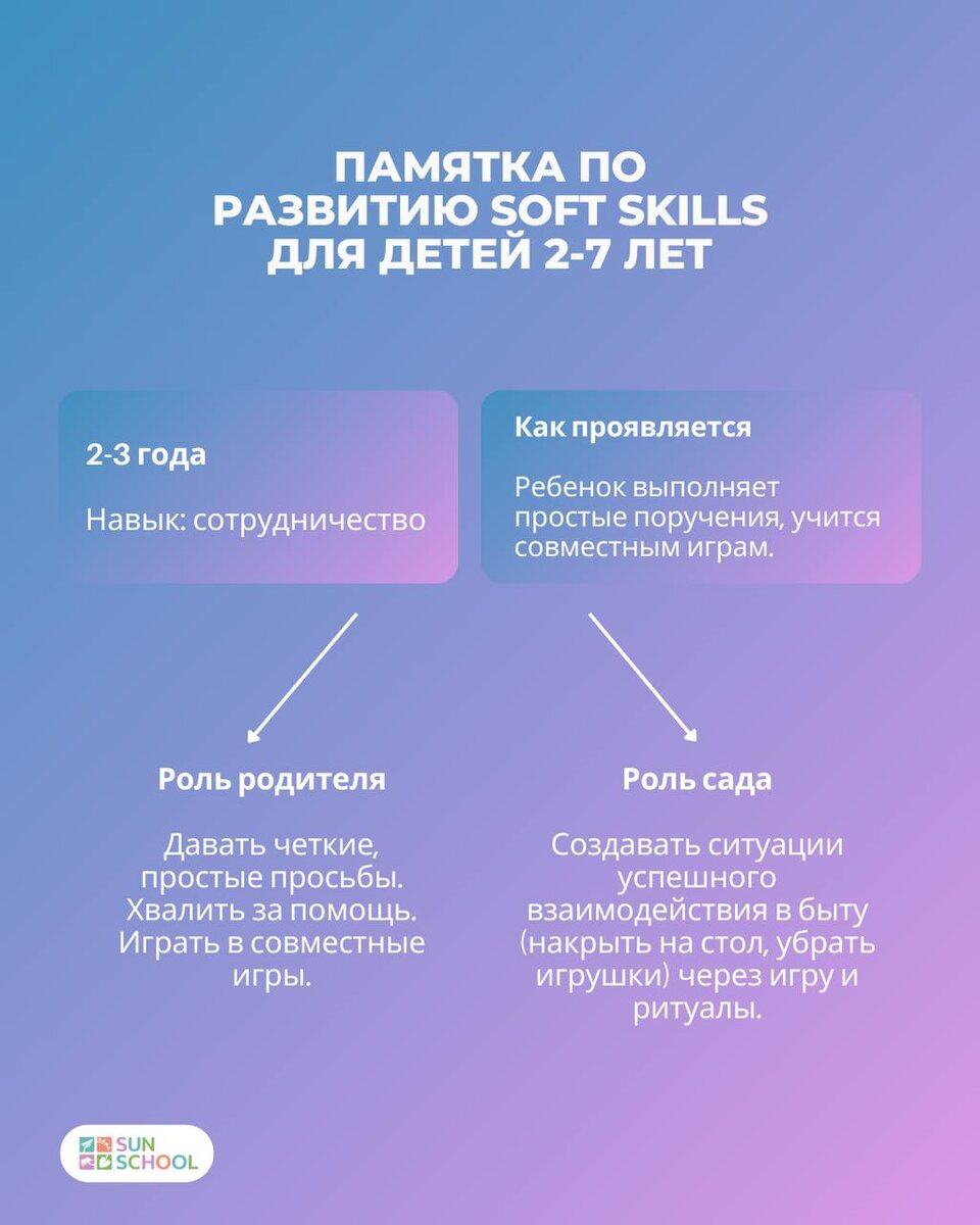 ➡️ Мы подготовили для вас памятку по развитию гибких навыков (soft skills) у детей от 2 до 7 лет. В Sun School этому уделяется особое внимание, потому что мы верим: именно эти умения — фундамент будущих успехов и счастливой жизни. Сохраните эту памятку и используйте как напоминание и ориентир! Развитие Soft Skills происходит в осознанной и поддерживающей среде. В наших садах каждый день — это возможность проявить любознательность, договориться с другом и научиться управлять своими эмоциями. Мы создаем эту среду вместе с вами, потому что лучшие результаты всегда рождаются в партнерстве семьи и воспитателей ✨ Еще больше полезных материалов в нашем telegram-канале