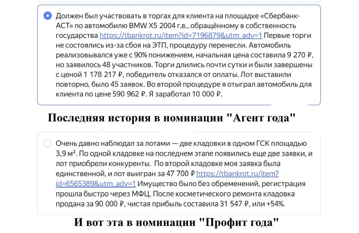 ! В очередной раз участвую в TBankrot Awards и сразу в двух номинациях: 🏆 Агент года 💰 Профит года В каждой номинации представлены реальные истории из моей практики. Поддержите своим голосом по ссылке в Яндекс-форме👇 В номинации «Агент года» — история о приобретении автомобиля BMW по агентской схеме. В номинации «Профит года» — сделка, по приобретению кладового помещения с минимальными вложениями и хорошей прибылью после реализации. 📌 Голосование по ссылкам: 👉 https://forms.yandex.ru/u/6968c319f47e730020544cec Агент года 👆 https://forms.yandex.ru/u/6968cd7790fa7b02ff8db236 Профит года 👆 Скрины моих историй для поиска в формах приведены на фото ☝️ Спасибо за вашу поддержку! 🫂 __ Бывший Граф