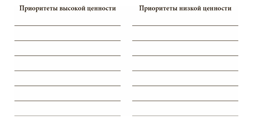 Теперь проанализируйте все ваши ответы и выводы, которые вы для себя сделали. Выберитесь из рабочей рутины, в которую вы погрузились с головой, и начните инвестировать все свои усилия в то, что позволит вам двигаться вперед. Для начала разделите ваш список задач на две колонки: приоритетная работа и незначительная работа (см. рисунок).