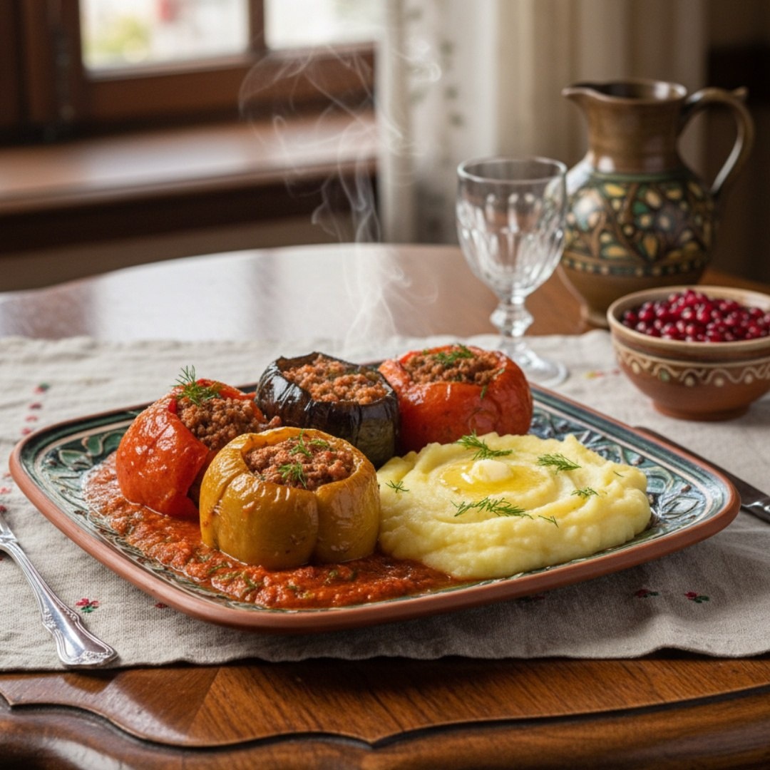 Ингредиенты⤵️ 🔸Болгарский перец — 4-5 шт. 🔸Баклажаны — 2 шт. 🔸Фарш мясной — 500 г 🔸Рис — 3 ст.л. 🔸Лук репчатый — 1 шт. 🔸Чеснок — 3 зубчика 🔸Томатная паста — 2 ст.л. 🔸Вода — 300 мл 🔸Соль, перец, зира, кинза — 1 щепотка 🔸Масло растительное — 3 ст. л. 🔸Картофель — 800 г 🔸Молоко — 100 мл 🔸Сливочное масло — 50 г Приготовление🍆 1. Приготовить начинку: смешать фарш, полуготовый рис, лук, чеснок, зелень, специи. 2. Подготовить овощи: удалить семена из перцев, из половинок баклажанов выбрать часть мякоти (оставив стенки), мякоть нарезать. 3. Начинить овощи фаршем. 4. Обжарить фаршированные овощи в масле 5–7 минут до корочки. 5. Добавить томатную пасту, разведённую водой, и нарезанную мякоть баклажанов. Тушить под крышкой 30–40 минут. 6. Приготовить пюре: размять отварной картофель с молоком, маслом и солью. 7. Подавать дучмаки на пюре, полив соусом. Рецепт дня #дучмаки #фаршированные_овощи #картофель #пюре #фарш_мясной