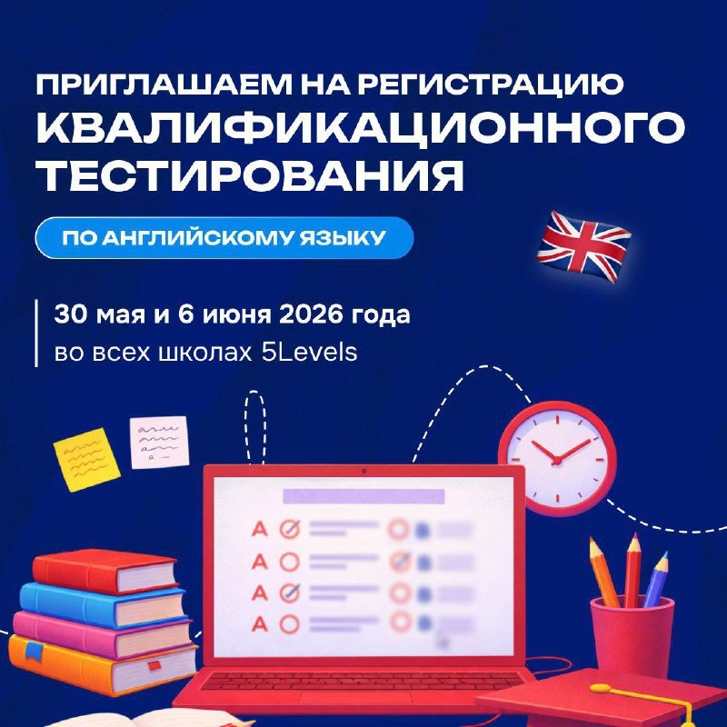!🇬🇧🎓📚 📅 Экзаменационная сессия пройдет 30 мая и 6 июня 2026 года. 📝 По итогам прохождения тестирования будет выдан сертификат, подтверждающий языковой уровень. Тестирование и проверку будут проводить опытные сертифицированные экзаменаторы и эксперты. 📍Адреса: ул. Адмирала Лазарева, 63 к.2; ул. Поляны 5А к.3; ул. Липовый парк, д.7; ул. Скандинавский б-р, д.9; г. Балашиха, ул. Летная, д. 5/5. 📲 Запись по телефону: +79057155570 или у администратора 5Levels.