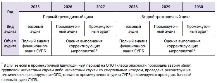 ? В организациях, эксплуатирующих ОПО I класса опасности, аудит СУПБ проводится ежегодно (п. 6 ст. 11 Федерального закона № 116-ФЗ). Ростехнадзор рекомендует проводить аудиты трехгодичными циклами: ✅ базовый или полный аудит СУПБ достаточно проводить один раз в три года. Включает анализ системы взаимодействия служб и подразделений эксплуатирующей организации друг с другом и подрядными организациями в рамках СУПБ в целях предупреждения аварий, несчастных случаев и инцидентов на ОПО; ✅ два последующих (промежуточных) аудита СУПБ 3-летнего цикла рекомендуется проводить как оценку выполнения корректирующих мероприятий по устранению выявленных в ходе базового (полного) аудита нарушений требований промышленной безопасности и совершенствованию СУПБ.