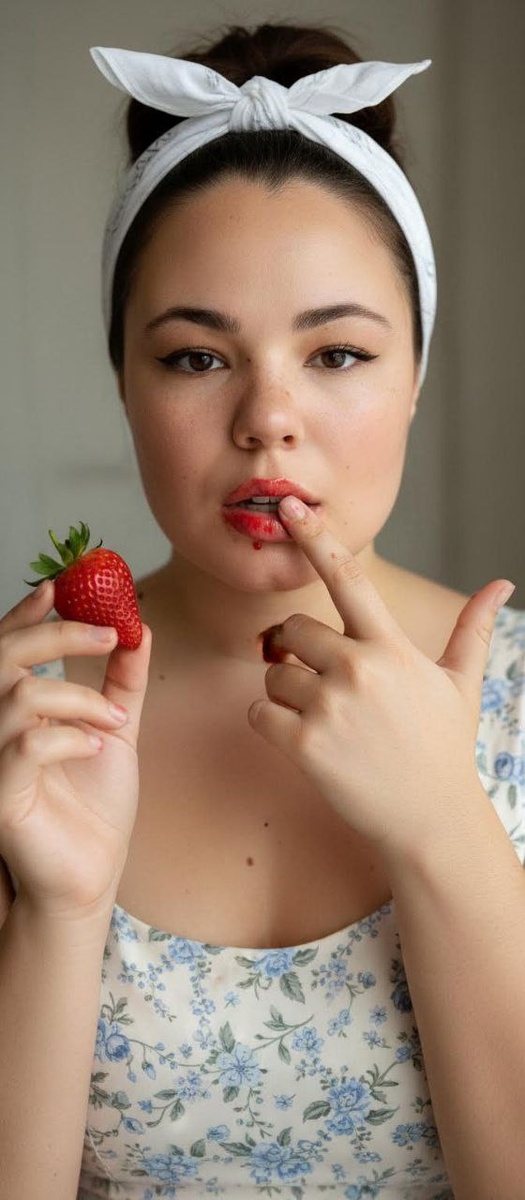 Фотореалистичный портрет в стиле fashion-editorial с лёгкой арт-провокацией. Молодая девушка с длинными тёмными волосами и светлой кожей с естественными веснушками смотрит прямо в камеру. На голове белая тканевая косынка, образ вдохновлён эстетикой ретро-молочницы и французской девушки. В одной руке она держит спелую красную клубнику с зелёными листьями, другой палец она подносит к губам. На губах и пальцах видны следы клубничного сока, создающие эффект сочной, немного дерзкой и чувственной атмосферы. Девушка одета в светлое платье с голубым цветочным принтом. Фон минималистичный, светлый, без лишних деталей, чтобы всё внимание было сосредоточено на лице, текстуре кожи и ягодах. Композиция: крупный портрет по грудь, центральная композиция, фокус на глазах, губах и руках, небольшая глубина резкости, фон мягко размыт. Освещение: мягкий естественный свет, имитация съёмки у большого окна, фронтальное рассеянное освещение с лёгким боковым акцентом, подчёркивающим текстуру кожи, веснушки и г