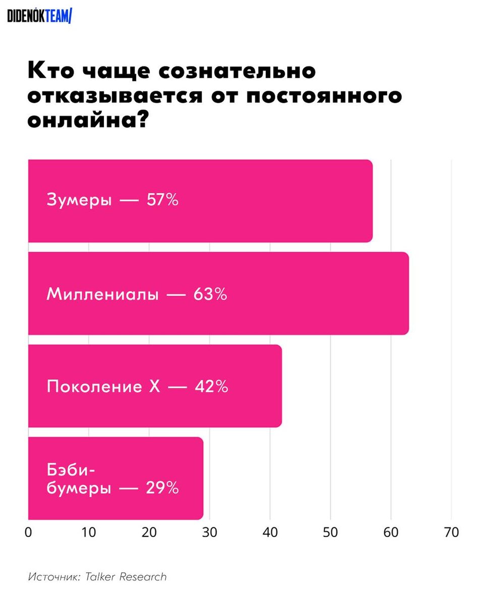 🕊 По данным исследования Talker Research, 50% людей намеренно стали меньше сидеть в экранах. Причём чаще всего это делают молодые. Более «осязаемые» и «старые» практики стали сменять диджитал-удобства. Молодёжь использует бумажные блокноты, печатные книги, фотоаппараты, играет в настольные игры, просыпается от аналоговых будильников. По сути, это всё, что можно потрогать и разложить на столе 📷✨ ⭐️ Респонденты отмечают, что в таком режиме чувствуют себя более собранными, спокойными и не выпадают из реальности. При этом около 70% признаются, что значительная часть времени в интернете усиливает тревожность, раздражительность и неудовлетворенность жизнью 😰 Показательно, что именно поколение, выросшее в условиях цифрового прогресса, первым делает шаг в сторону офлайна. Теперь фраза «это всё из-за телефона» больше применима к бумерам, чем к зумерам 😎 А вы устраиваете себе цифровые детоксы? #DTalks 🩷 Подписаться на DIDENOK TEAM