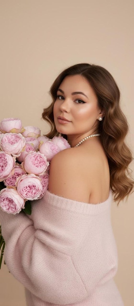Использовать реальные черты лица человека с референса, естественную текстуру кожи и настоящий цвет и длину волос. Личность должна оставаться неизменной. Создай крупный, эстетичный портрет женщины со спины, она смотрит через плечо . Женщина держит в руках огромный, огромный пышный букет нежно-розовых пионовидных кустовых роз. На ней объемный пушистый свитер нежно розового цвета спущенный с плеча . Макияж нюд загорелая кожа акцент на скуловой зоне, выразительные глаза с черной стрелкой, блеск на губах. Волосы распущены, легкие волны. Сходство 100%. Из украшений — жемчужные серьги и жемчужное ожерелье, элегантно спадающее на открытую спину. Мягкое естественное освещение, пастельный бежевый фон, атмосфера нежности, чистоты и стиля «old money». Высокая детализация текстуры ткани и лепестков цветов, профессиональное фото, глубина резкости. Soft natural lighting, pastel beige studio background, romantic and sophisticated vibe, "old money" aesthetic. High detail on sweater texture and flower
