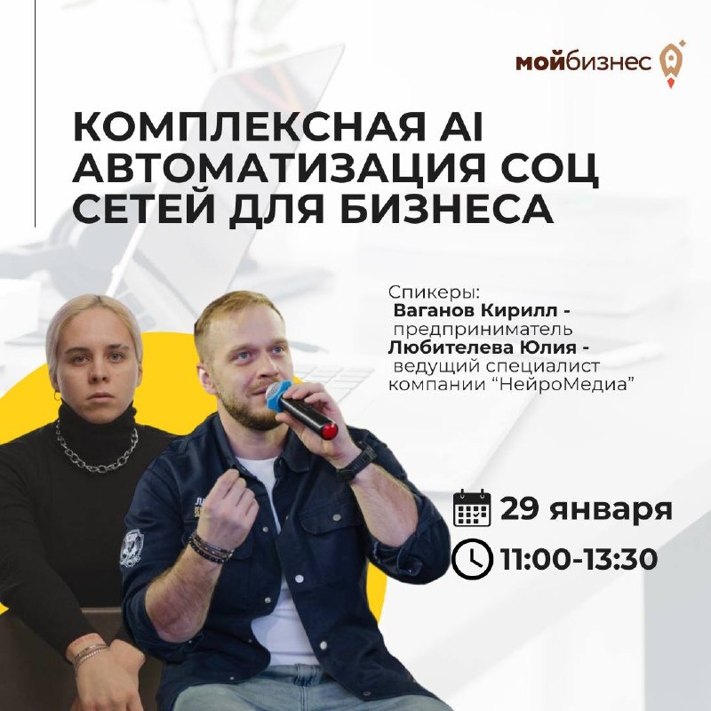 » 🗓 ДАТА: 29 января 2026 г. (четверг) ⏰ ВРЕМЯ: 11:00 📍 МЕСТО: пл.Дзержинского, д.3, вход с ул.Кирова, здание ТПП 🎯 СПИКЕРЫ И ПРОГРАММА: 1️⃣ «Искусственный интеллект. Тренд или неизбежность» - спикер Ваганов Кирилл, предприниматель, общественный и политический деятель. 2️⃣ «Автоматизация социальных сетей. Комплексное решение на основе искусственного интеллекта» - спикер Любителева Юля, ведущий специалист компании «НейроМедиа» Ответы на какие вопросы вы получите: БЛОК №1 ▪️Что такое Искусственный интеллект и с чем его едят? ▪️Важно ли предпринимателю использовать ИИ в бизнес-процессах? ▪️Как масштабировать бизнес за счет внедрения ИИ в СММ? БЛОК №2 ▪️Как заставить ИИ приводить тебе клиентов? ▪️Презентация сервиса по автоматизации всех популярных социальных сетей. 💰 СТОИМОСТЬ: в рамках программы поддержки - бесплатно! 📌 РЕГИСТРАЦИЯ ОБЯЗАТЕЛЬНА: по ссылке Ваш центр «Мой бизнес» ✅ Канал «Мой бизнес» в МAX