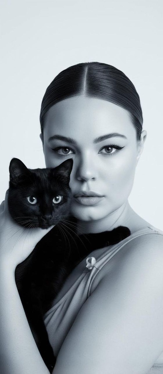 close to her face, intense direct gaze into camera, sharp feline eye contact mirrored with model, slicked-back hair pulled tightly, clean middle part, sculpted face with strong cheekbones, bold black winged eyeliner, matte nude lips, porcelain skin with high contrast shadows, smooth studio background in pale off-white, soft directional key light from front-left, subtle shadow sculpting on jawline and nose, high contrast lighting emphasizing symmetry, minimalist sleeveless top exposing shoulders and collarbones, no jewelry, no distractions, focus strictly on face and cat, black cat with glossy fur texture and piercing eyes, cinematic fashion editorial, Vogue-style portrait, luxury aesthetic, cold elegance, timeless, powerful, controlled, ultra sharp focus, professional studio photography, 85mm lens look, shallow depth of field, editorial perfection, no text, no logos, no background clutter. #женские #сживотными@annapromtii20