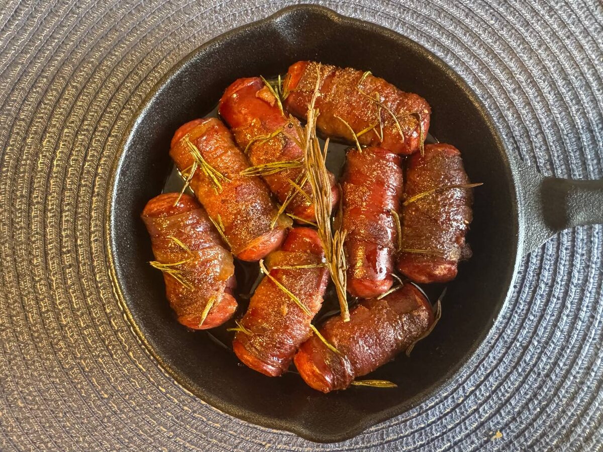Блюдо из разряда «и подать не стыдно и съедят - не жалко» Ингредиенты: 1️⃣ Сосиски, а ещё лучше охотничьи колбаски 2️⃣ Бекон (лучше сырокопчёный) из расчёта 1 полоска на 1 сосиску 3️⃣ для соуса 1 ложка мёда и 1 ложка соевого соуса. 4️⃣ любимые приправы или специи. Приготовление: 1. Маленькая хитрость. Разворачиваем, на доске, полоску бекона и разглаживаем её тупой стороной лезвия ножа. Бекон становится шире, тоньше и длиннее. Можете не делать 😉 2. Оборачиваем колбаски беконом. Для удобства, можно разрезать их поперёк на 2 половинки. Укладываем в форму для запекания или сковороду. Отлично будет, если посыпать их розмарином или свежемолотым чёрным перцем. 3. Запекаем в духовке 15-20 минут при 180 градусах, в нижней трети. Можно с верхним нагревом и конвекцией, тогда это будет 10-15 минут. 4. Смешиваем мёд и соевый соус и полив сосиски ещё минут 5-7 доведём их в духовке. 5. Подавайте с любым гарниром. Ангела за трапезой! Ваш ПП - Православное Питание - канал о пище, не только телесно