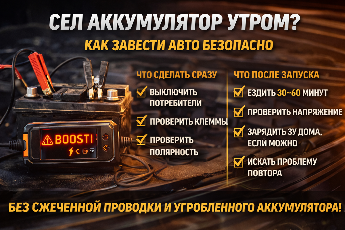 Сел аккумулятор утром это классика. Поворачиваешь ключ, стартер щелкает, приборка моргает, и настроение тоже моргает. Дальше у людей два пути. Первый путь паника и случайные действия. Второй путь четкий план, чтобы завести авто безопасно, не спалить проводку и не добить аккумулятор.