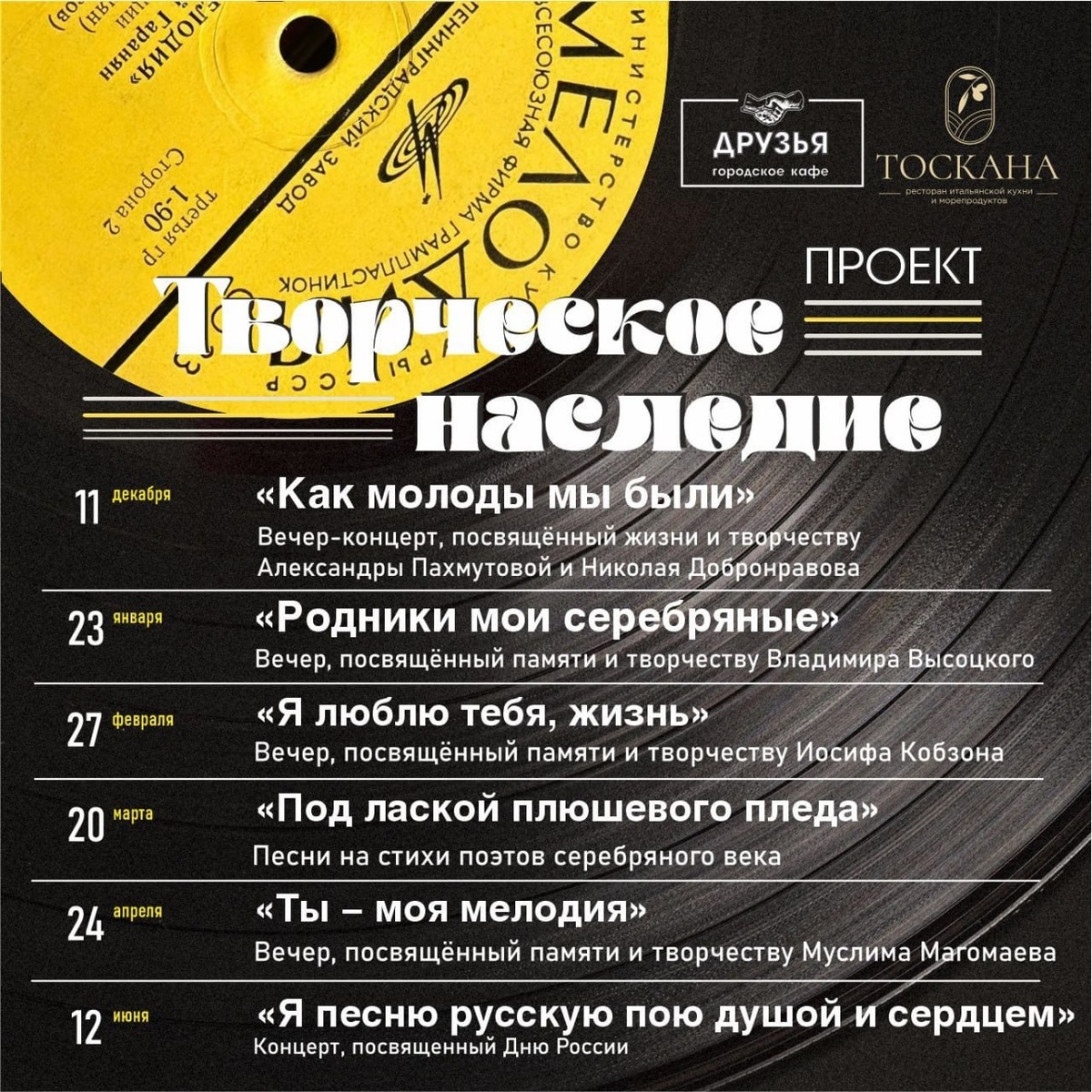 » 🙌🏻 #идёмплатно в ресторан итальянской кухни «Тоскана» ➡️ Уточнить все детали можно в группе ➡️ Гостей ждут: — музыкальные вечера, посвящённые великим композиторам, поэтам и музыкантам; — фуршет и прекрасный ужин; — интересные истории из жизни великих людей. 💬«Насладитесь атмосферой живой музыки, душевных встреч и изысканной кухни», — отметили организаторы. Не забудьте подписаться на наш канал ❤️