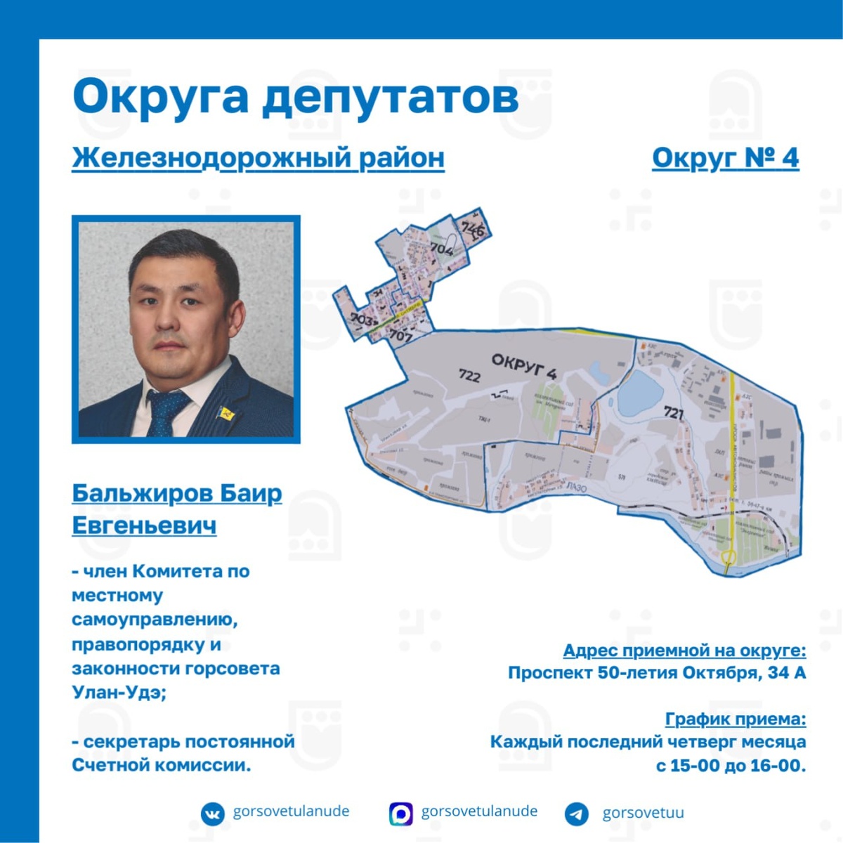 🔷Избирательный округ №4 🔹Округ № 4 является одним из центральных не только Железнодорожного района, но и Улан-Удэ в целом. Здесь сосредоточены основные артерии города и социальная инфраструктура, в том числе несколько школ, детских садов и колледжей. 🔹Депутатом округа является Баир Евгеньевич Бальжиров, член Комитета по местному самоуправлению, правопорядку и законности горсовета Улан-Удэ, секретарь постоянной Счетной комиссии. 🔹В 2024 году в границы округа №4 включили жилые дома микрорайона Кирзавод и ТЭЦ-1, а это преимущественно частный сектор. Помимо создания и обновления социальной инфраструктуры акцент в работе на округе будет сделан на благоустройство придомовых территорий. 📍Адрес приемной на округе: Проспект 50-летия Октября, 34А 📆График приема: Каждый последний четверг месяца, с 15-00 до 16-00. Подробнее о том, какие улицы в границы округа №3 – в нашем канале в МАХ 👉 👉 Горсовет Улан-Удэ в MAX | Telegram | ВК | ОК