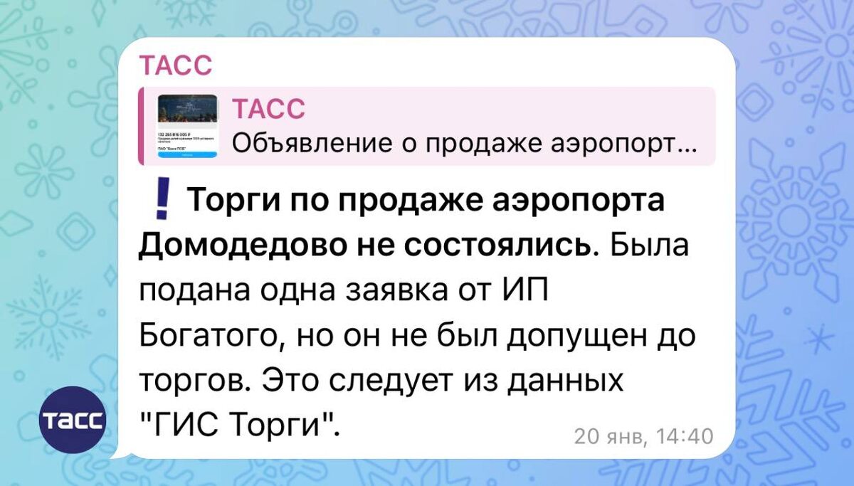 ⚡️ Аэропорт не продали на аукционе, потому что была подана всего одна заявка, и её не допустили до торгов. Этой заявкой был ИП Богатый. Признавайтесь, кто из вас? 👀