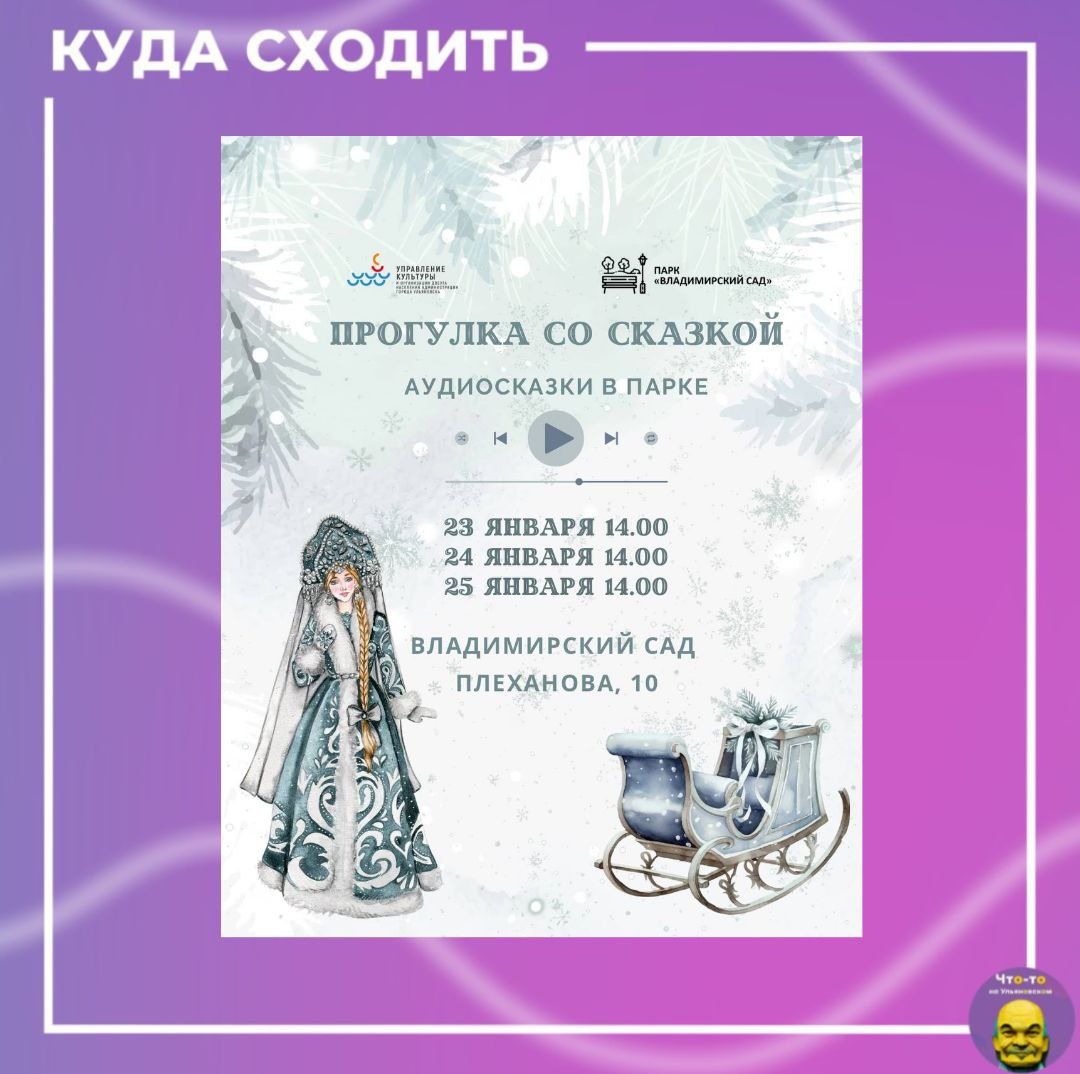 !🎶 Владимирский сад приглашает на необычную зимнюю прогулку - насладиться морозным воздухом, заснеженными пейзажами и послушать любимые аудиосказки. Это увлекательное путешествие в мир детства и приятных воспоминаний. Сказочные истории оживут в вашем воображении, наполняя сердце теплом и радостью! 📅Когда: — 23 января 14.00 — 24 января 14.00 — 25 января 14.00 📍Где: Владимирский сад, улица Плеханова, 10 🏷 Вход свободный #куда_пойти_ул