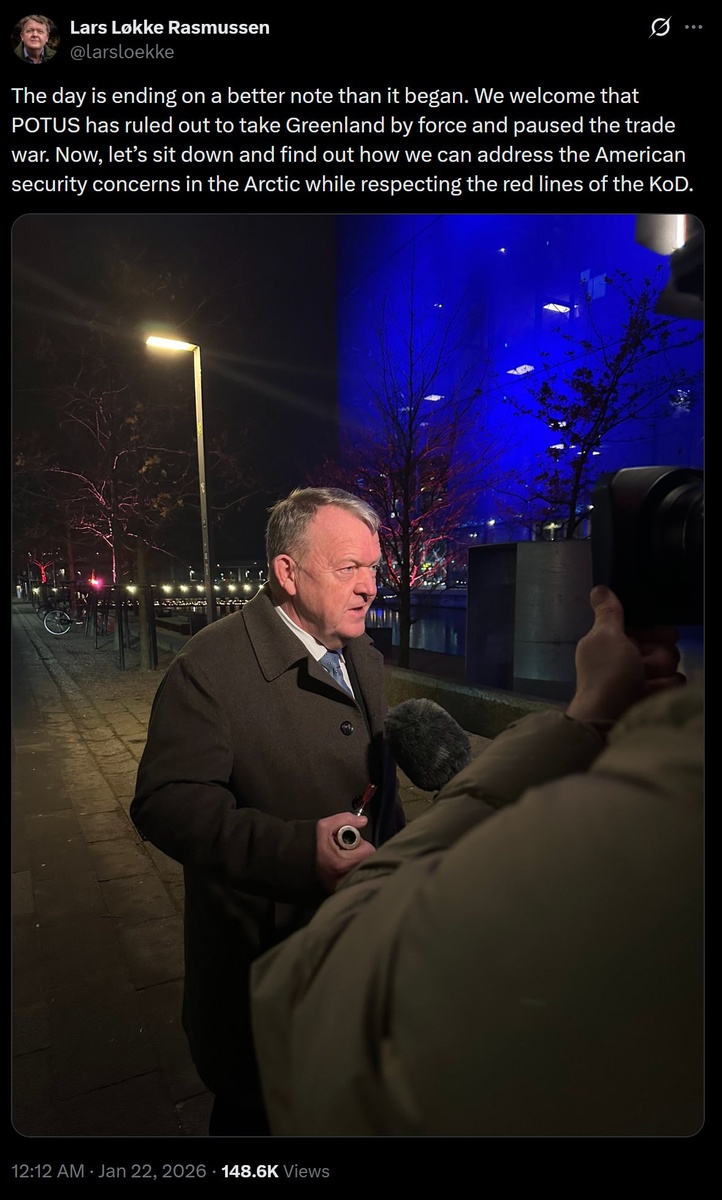 : День заканчивается на более позитивной ноте, чем начался. Мы приветствуем тот факт, что президент США исключил силовой захват Гренландии и приостановил торговую войну. Теперь давайте сядем за стол переговоров и найдём способ учесть интересы безопасности Америки в Арктике, не переходя при этом красных линий Королевства Дания. 🟪Читай в Max | 🚀Читай в Telegram | 🥰Смотри на RUTUBE