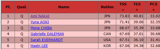 Уровень женского турнира на ЧЧК повыше, чем на Чемпионате Европы, но все же недостаточно высок, если на промежуточном третьем месте находится Моне Чиба (68.07 - 3 место) с падением на лутце. На первых двух местах еще две фигуристки из Японии. Юна Аоки (71.41 - 2 место) обратила на себя внимание риттовым каскадом 3+3 и это, между прочим, в 24 года, а одна из реальных претенденток на будущий Олимпийский пьедестал Ами Накаи (73.83 - 1 место) больше всех понравилась в части презентации и исполнила тройной аксель с небольшой помаркой на приземлении. Ссылки на видео прилагаются.