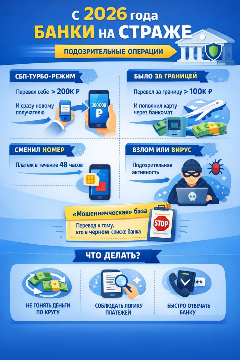 » 😅 🗣ЦБ расширил список признаков, по которым перевод могут поставить на паузу: было 6 критериев, стало 12. Основание — приказ Банка России от 05.11.2025 № ОД-2506. Что это значит по-человечески❓ 👩🏻💻Вы делаете перевод, а банк может сказать: «Погодите… это точно вы? А не ваш “лучший друг из службы безопасности”?» И попросит подтверждение. Самые “триггерные” сценарии (которые часто выглядят как нормальная жизнь) 1️⃣ “Погонял деньги через СБП” Если вы меньше чем за 24 часа перегнали сами себе через СБП > 200 000 ₽, а потом отправляете человеку, кому не переводили последние 6 месяцев — это красный флажок. 2️⃣ “Перевёл за границу — и сразу пополнил наличкой” Если было > 100 000 ₽ переводов физлицам за рубеж и в течение 24 часов после этого вы пытаетесь внести деньги через банкомат (в т.ч. “цифровой” картой) — банк насторожится. 3️⃣ “Смена номера — и сразу платеж” Платеж в течение 48 часов после смены номера в банке/на Госуслугах — тоже подозрительно. 4️⃣ “Телефон/аккаунт могли