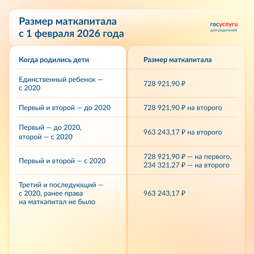 Например, на первого ребенка размер господдержки составит 728 921,90 ₽ — на 38 655 ₽ больше, чем в 2025 году. В карточке — размер маткапитала после индексации с 1 февраля 2026 года. ❗️ Если маткапитал уже оформлен, индексируется неиспользованный остаток. То есть часть денег, которая находится на лицевом счете. 👉 Проверить остаток маткапитала — сумма с учетом индексации отобразится после перерасчета. Для обновления информации в выписке на Госуслугах потребуется несколько дней. 👉 Инструкции и сервисы для использования маткапитала — в специальном разделе на Госуслугах. @gosuslugiforparents