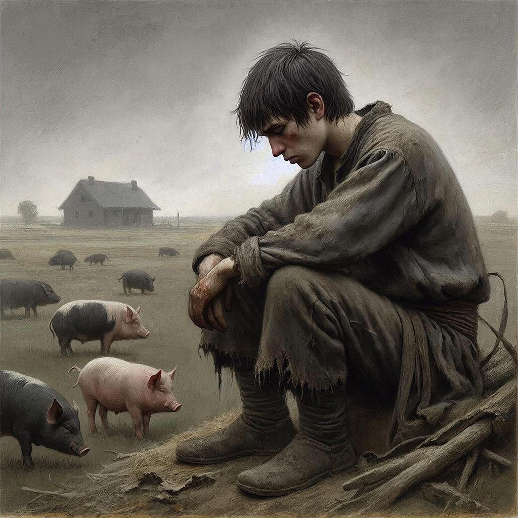 Работа пастухом свиней для иудея была символом крайнего унижения и нечистоты. Именно в этой точке отчаяния происходит ключевой поворот: «пришедши же в себя» (Лк. 15:17). Святой Августин видит в этом моменте возвращение к своему подлинному «я», которое возможно только в Боге: