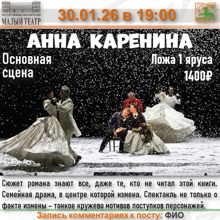 » 📆 30 января в 19:00 🏛 Малый театр, основная сцена 👛 Стоимость 1400₽ 🎫 В наличии 2 билета Действующие лица и исполнители: Анна Аркадьевна Каренина Полина Долинская Алексей Александрович Каренин народный артист России Виктор Низовой Граф Алексей Кириллович Вронский Нил Кропалов Князь Степан Стива Аркадьевич Облонский народный артист России Глеб Подгородинский Графиня Лидия Ивановна лауреат Государственной премии России Ирина Леонова Графиня Вронская, мать Алексея Вронского народная артистка России Людмила Титова Князь Александр Щербацкий, отец Долли и Кити заслуженный артист России Александр Титоренко Княгиня Щербацкая, мать Долли и Кити народная артистка России Светлана Аманова и другие. ☎Записались? Убедитесь, что заявка принята! Обязательно звоните председателю ППО! #МойТеатральныйМарафон #МалыйТеатр #АннаКаренина