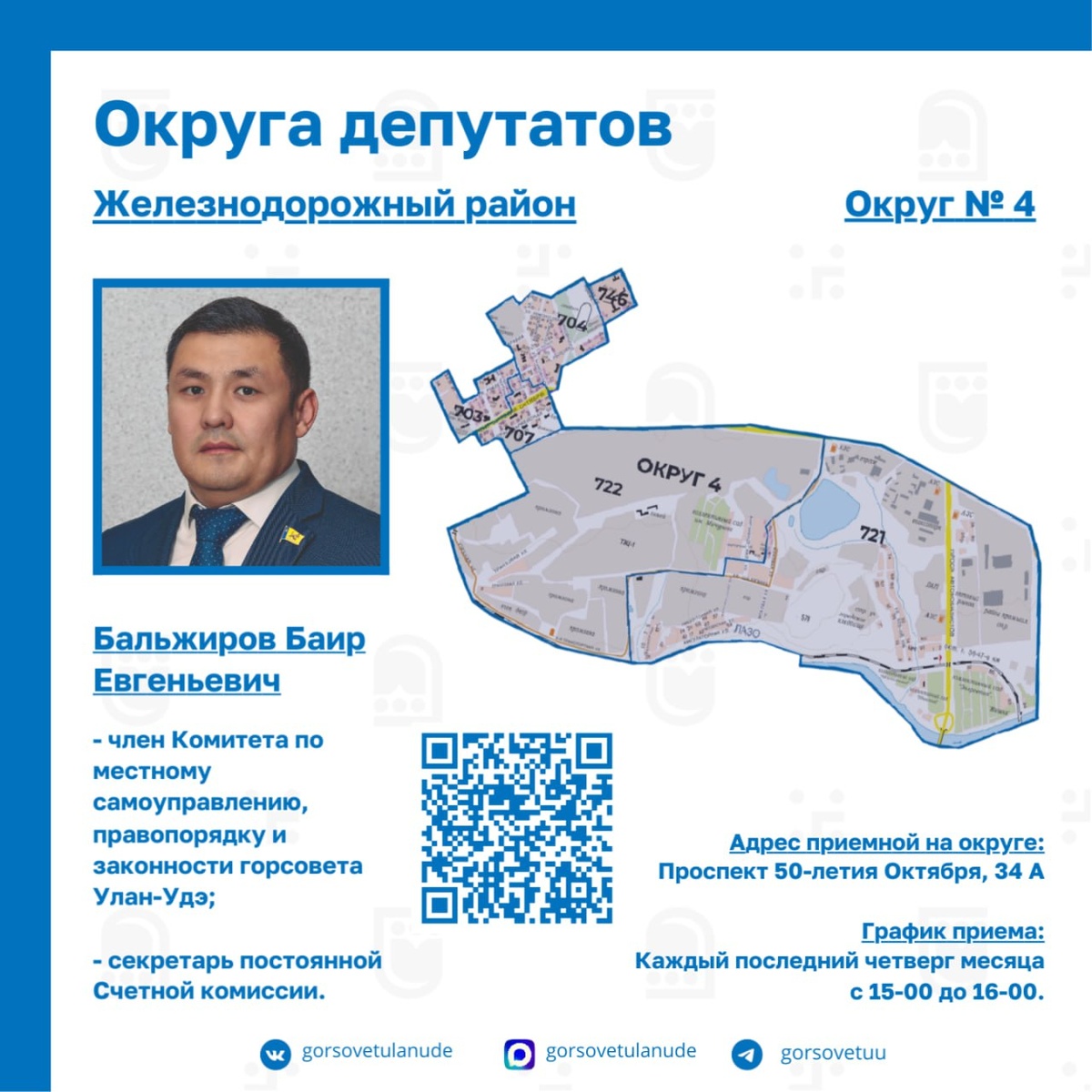 🔷Избирательный округ №4 🔹Округ № 4 является одним из центральных не только Железнодорожного района, но и Улан-Удэ в целом. Здесь сосредоточены основные артерии города и социальная инфраструктура, в том числе несколько школ, детских садов и колледжей. 🔹Депутатом округа является Баир Евгеньевич Бальжиров, член Комитета по местному самоуправлению, правопорядку и законности горсовета Улан-Удэ, секретарь постоянной Счетной комиссии. 🔹В 2024 году в границы округа №4 включили жилые дома микрорайона Кирзавод и ТЭЦ-1, а это преимущественно частный сектор. Помимо создания и обновления социальной инфраструктуры акцент в работе на округе будет сделан на благоустройство придомовых территорий. 📍Адрес приемной на округе: Проспект 50-летия Октября, 34А 📆График приема: Каждый последний четверг месяца, с 15-00 до 16-00. Подробнее о том, какие улицы, переулки и товарищества входят в границы округа №3 – в нашем канале в МАХ 👉 https://max.ru/gorsovetulanude/AZvkV1W-LaY 👉 Горсовет Улан-Удэ в