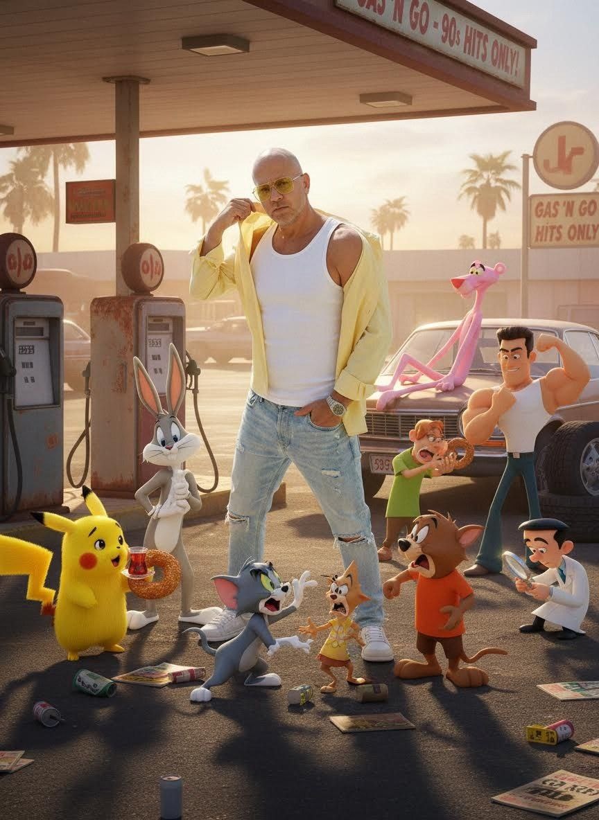 Ностальгический мультяшный кроссовер 90-х на заправке на придорожной. Главный герой — человек-реалист по загруженному фото, уверенно стоит среди культовых героев мультфильмов 90-х в стиле Pixar 3D. Пикачу с турецким чаем и симитом, Багз Банни опирается на бензонасос, Том и Джерри спорят на земле, Розовая Пантера расслабилась, Скуби-Ду и Шагги делятся симитом, Джонни Браво позирует, Декстер анализи Тёплый кинематографический дневной свет, игривый абсурдный юмор, ностальгический мультяшный ➡️ Генерируем ТУТ 💵 Отблагодарить