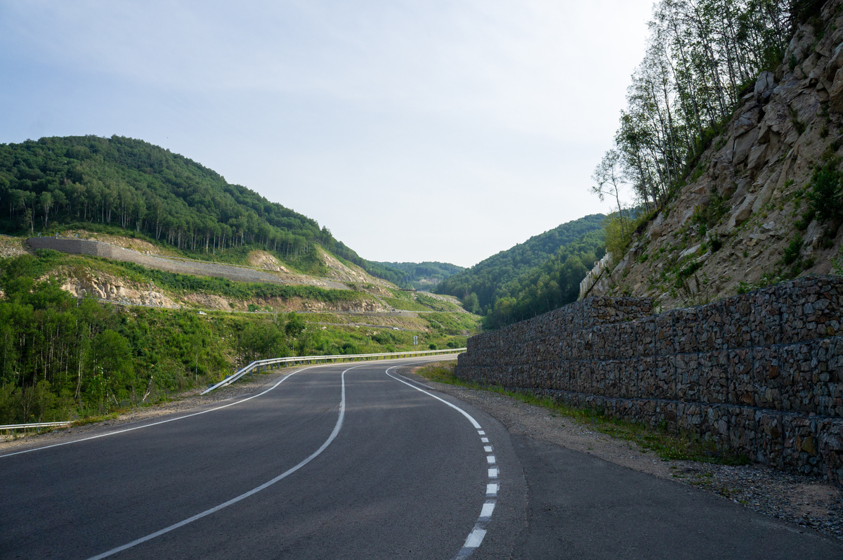 Я-то думал, что после Чуйского тракта меня уже ничем не удивишь. Но почти перед самым отъездом отправился в Белокуриху. И проехав город насквозь, увидел вот это. Даже не сразу понял, что все это — та же самая дорога, террасами взбирается на гору. Красота неописуемая! Я такое люблю, сразу видно, дорога горная. Как говорится, «рулевое колесо делает столько же оборотов, что и все остальные». Хотя зимой здесь, наверное, не так весело. Недаром столько аварийных съездов, что тут будет в гололед, лучше не думать. Внизу, кстати, стоит шлагбаум. Наверняка, чтобы закрыть, если совсем занесет. Но сейчас-то лето, и ехать по отличному новому асфальту одно удовольствие. На каждом ярусе смотровая площадка. Ведь так просто на такой дороге не остановишься, а все хотят рассмотреть получше. Посмотреть и правда есть на что. Для любознательных путешественников столб в середине — это компас. Стоим лицом строго на север. Но зачем же они сделали почти белую надпись на фоне светлой скалы? Если смотреть