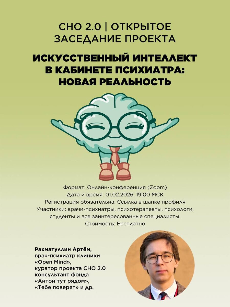 ИИ всё активнее входит в клиническую практику, и вопросов вокруг него становится только больше⤵️ Приглашаем на открытое заседание СНО 2.0, посвящённое использованию искусственного интеллекта в работе врача-психиатра. Поговорим о том, где ИИ может быть полезен уже сейчас, с какими этическими и профессиональными ограничениями сталкивается специалист, и какие сценарии развития видны на горизонте. Формат: онлайн-конференция (Zoom) Дата и время: 01.02.2026, 19:00 Участие бесплатное, по предварительной регистрации. Будет доступна запись собрания. Ждем на встрече психиатров, психотерапевтов, психологов, студентов и специалистов, которым важно понимать, как меняется профессия. Регистрация по ссылке.