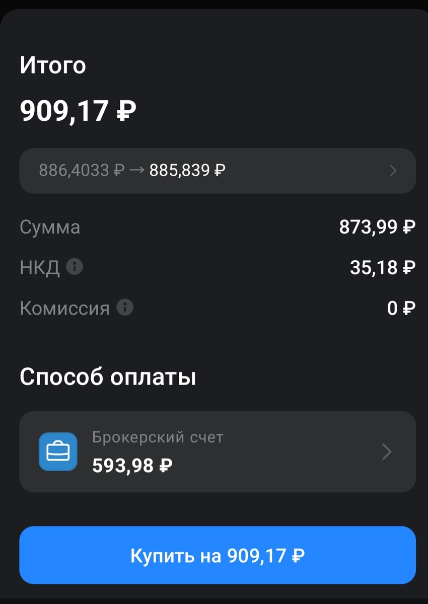 Открывая в приложении какую‑либо облигацию, вы видите доходность к погашению в процентах годовых. Но здесь есть нюанс — особенно для длинных ОФЗ. Разберу реальную доходность на примере ОФЗ 26245, которые есть в моём старом ИИС. В пенсионном портфеле у меня ОФЗ нет. Сначала важно понимать, из чего складывается эта доходность. Сейчас брокер показывает 14,99% годовых к погашению. Само погашение — 26 сентября 2036 года. На первый взгляд, зафиксировать почти 15% годовых на десять лет выглядит заманчиво. Но это не совсем так, и дело даже не в налоге в 13%, который тоже придётся заплатить. Сейчас эти бумаги торгуются по 87% от номинала, плюс накопленный купонный доход — около 35 рублей. Итого за одну бумагу нужно отдать около 909 рублей без учёта комиссии. Чтобы посчитать доход, нужно знать величину купона и цену покупки. НКД в расчёт не берём — он вернётся с выплатой ближайшего купона. Купон выплачивается дважды в год, по 59,84 рубля на облигацию. Это 12% от номинала, но мы покупаем дешевле
