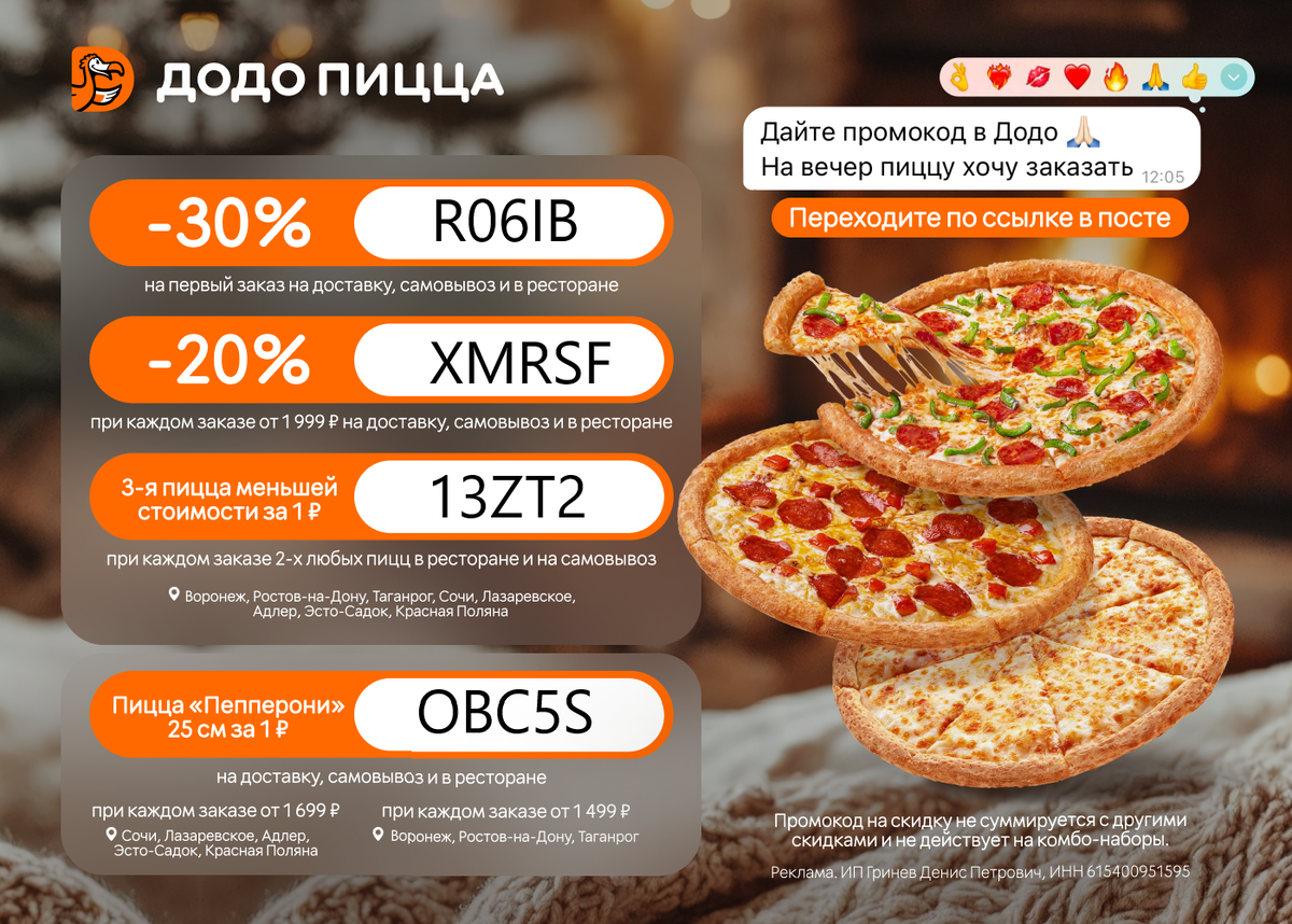 🍕 R06IB – Скидка 30% на первый заказ (Воронеж, Ростов-на-Дону, Таганрог, Сочи, Лазаревское, Адлер, Эсто-Садок, Красная Поляна) на доставку, самовывоз и в ресторане 🍕 XMRSF – Скидка 20% при каждом заказе от 1999 ₽ (Воронеж, Ростов-на-Дону, Таганрог, Сочи, Лазаревское, Адлер, Эсто-Садок, Красная Поляна) на доставку, самовывоз и в ресторане 🍕 OBC5S – Пицца "Пепперони" 25 см за 1 ₽ при каждом заказе от 1499 ₽ (Воронеж, Ростов-на-Дону, Таганрог) и от 1699 ₽ (Сочи, Лазаревское, Адлер, Эсто-Садок, Красная Поляна) на доставку, самовывоз и в ресторане 🍕 13ZT2 – 3-я пицца меньшей стоимости за 1 ₽ при каждом заказе 2-х любых пицц (Воронеж, Ростов-на-Дону, Таганрог, Сочи, Лазаревское, Адлер, Эсто-Садок, Красная Поляна) в ресторане и на самовывоз Заказать по ссылке https://dodo1.prfl.me/profitable_promo_codes/es1gua?erid=2VtzqxgmWzo Промокоды на скидку не суммируются с другими скидками и не действуют на комбо-наборы. Реклама. Индивидуальный предприниматель Гринев Денис Петрович, ИНН 61540095159