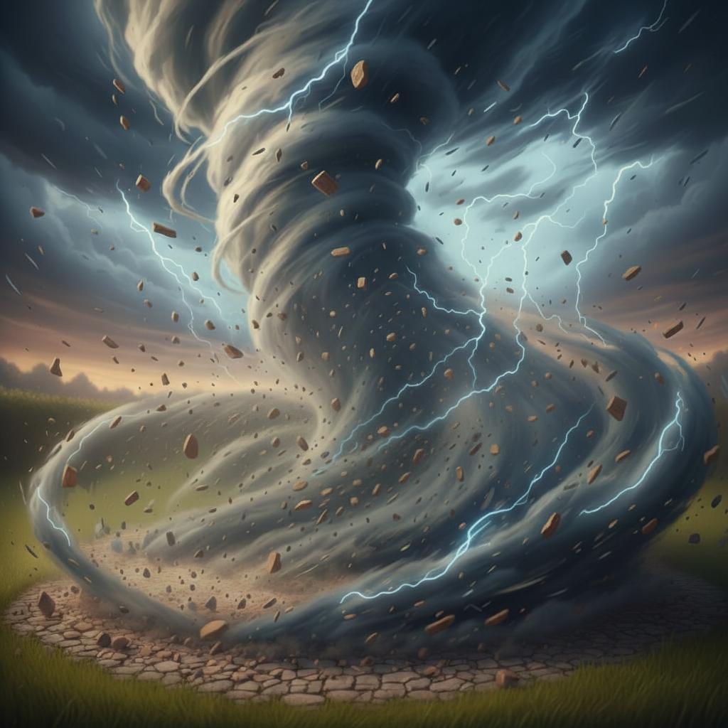 С этими словами Плюш не спеша подошёл к калитке и, отворив её, оказался на дороге. Обойдя небольшую рощу, он очутился на краю поля, где всё было хорошо видно. Увиденное повергло его в ужас. Прямо по полю, приближаясь с огромной скоростью, на Плюша надвигались чёрные тучи, а впереди, словно предводитель этой тучной армии, летел смерч, затягивая в свою воронку всё, что попадалось на пути. Плюш остолбенел от страха. Несмотря на клубы пыли, он отчётливо видел кружащихся в воронке коров, которые только что паслись на поле, разных лесных обитателей, а также старую телегу, стоявшую на окраине леса уже сотню лет.