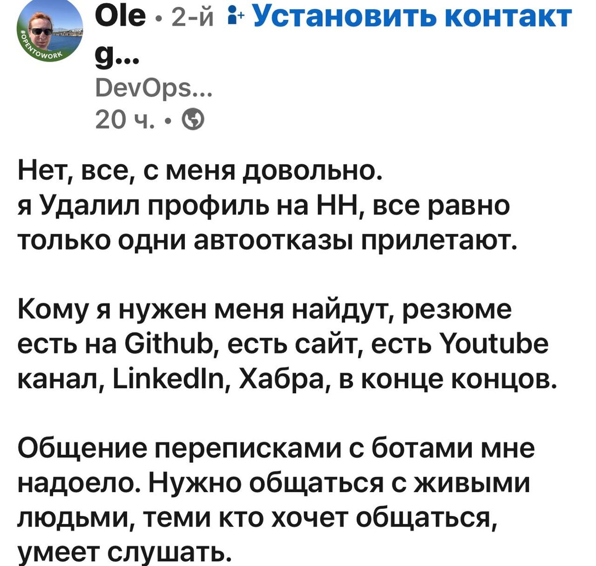 Хочешь найти работу в ИТ? Активничай до безумия. Ну а так желаю удачи 👍 без иронии! P.s хх сейчас активно внедряет ИИ для разбора и подбора. Человек меньше вовлечен в найм Русский ИТ бизнес