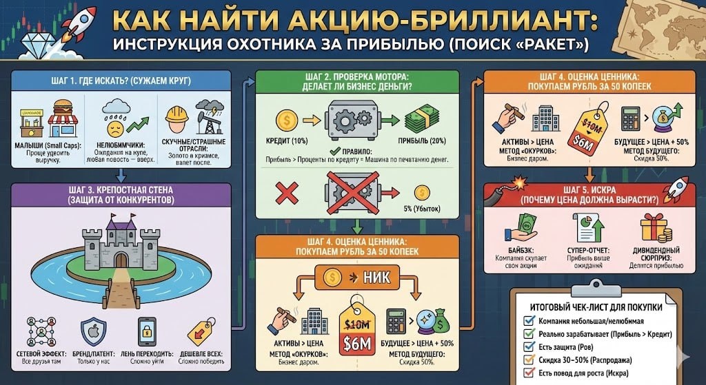 #теория Вы хотите найти не просто компанию, которая немного подрастет, а настоящую «ракету», которая может удвоить или утроить ваши вложения? Секрет не в удаче, а в поиске ошибки. Вам нужно найти ситуацию, где рынок (толпа инвесторов) сильно ошибается, считая хорошую компанию плохой или скучной. Вот пошаговый рецепт, как найти такие компании, используя методы легендарных инвесторов, но простыми словами. --- Шаг 1. Где искать? (Сужаем круг) Не тратьте время на гигантов вроде Apple или Coca-Cola — они уже слишком большие, чтобы быстро вырасти в 5 раз. Ищите в трех местах: 1. Малыши (Small Caps): Маленькому бизнесу проще вырасти в два раза, чем огромной корпорации. Представьте: ларьку с лимонадом легче открыть второй ларек и удвоить выручку, чем «Макдоналдсу» открыть еще 40 000 ресторанов. 2. Нелюбимчики (Низкие ожидания): Ищите акции, в которые никто не верит. Если все вокруг кричат «компания умирает», а она на самом деле просто приболела и скоро поправится — это ваш шанс. Когда ожи