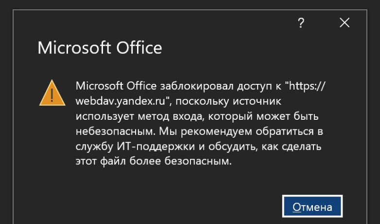 Как убрать ошибку Microsoft Office при работе с Yandex диском подключенным через WebDAV