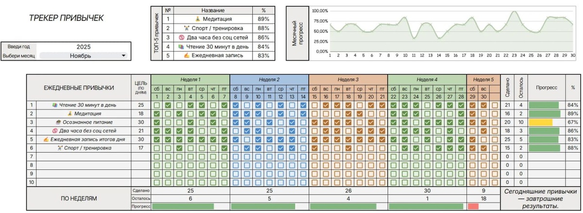 наслоение привычек, атомные привычки, как закрепить привычку, трекер привычек таблица. Самый простой способ внедрить новую привычку — привязать её к уже существующей. «После того как я закрою все задачи в таблице (старая привычка), я отмечу прогресс в трекере привычек (новая)». Когда ваш трекер задач и трекер привычек находятся в одной экосистеме (Google Таблицах), наслоение происходит естественным образом. Вы не открываете новое приложение, вы просто переходите на другую вкладку. Визуальная «цепочка» выполненных дней в таблице создает психологический стимул не прерывать процесс. Создайте свою цепь: Полноценный трекер привычек доступен в каталоге @Ordo_system_bot. Начните строить систему дисциплины сегодня.