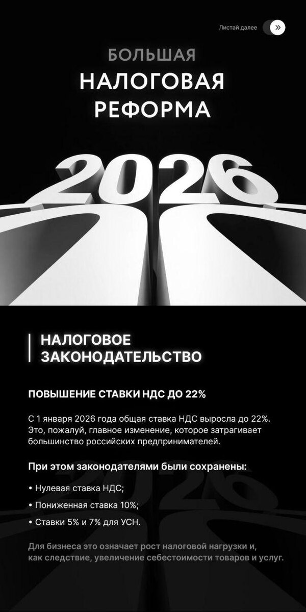 С 1 января 2026 года российский бизнес работает по новым правилам. Налоговая реформа, которую обсуждали весь прошлый год, официально вступила в силу и уже напрямую затронула большинство предпринимателей. 🔵 Не только рост ставок Изменения не ограничились привычным повышением налоговых ставок. Одновременно были пересмотрены: 🔻сроки уплаты налогов, 🔻порядок применения специальных налоговых режимов, 🔻правила начисления страховых взносов, 🔻сама логика налогового администрирования. Фактически бизнес столкнулся не с точечной корректировкой, а с комплексной перестройкой системы. 🔵 Что важно учесть в 2026 году В этом посте разобрано, какие именно изменения начали действовать с 1 января 2026 года, как они отражаются на работе компаний и предпринимателей и на что стоит обратить внимание, чтобы пройти год без штрафов и лишних доначислений. Листайте и смотрите детали. 🔵 Для тех, кто хочет меньше рисков и больше предсказуемости Если вы хотите развивать бизнес, не тратя ресурсы на пост