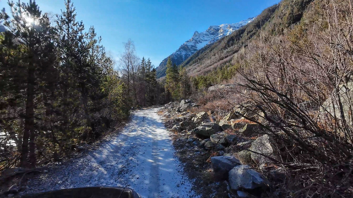 Обычно снег не даёт нам сходить в долину – дальше камней с лестницей не пройти, но пока снега мало можно попытаться. В самом начале ущелья Узункол дорога без снега, зелень – хоть уже и жухлая, но есть, но стоит нам заехать чуть глубже, сразу появляются обледенелые участки дороги, ледяные корки на реке и камнях, а на ветках, что соприкасаются с водой, зима создает причудливые фигуры изо льда. Обманчивое состояние отсутствия снега… Переехав мост около базы попадаем уже в царство снега, на дороге следы диких животных, которые теперь могут себе позволить бегать где захотят, людей поубавилось. Ворота открыты, до камней можем доехать на машине. Лёд на реке пока лежит не слишком плотный, поэтому переходим, как всегда – через камни, хотя и немного скользко по ним идти. На пути, то тут, то там встречаются полянки с ледяными цветами – кристаллами льда на траве. В воде колышутся ярко зеленые водоросли. Сегодня мы идём не так как всегда – решили пройти по другой стороне, не переходили мосты к водо