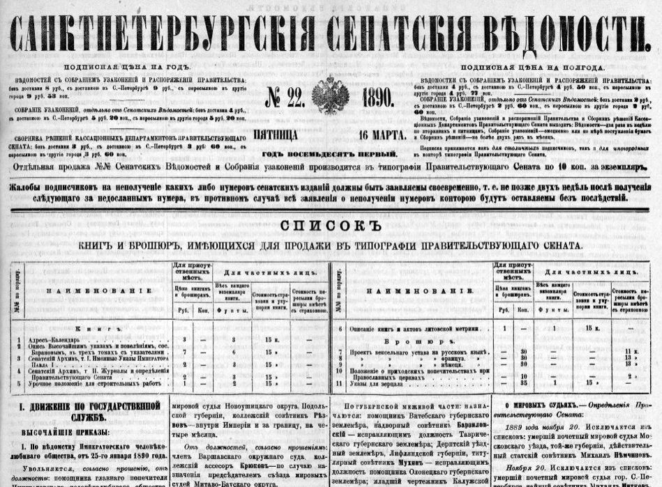 Санкт-Петербургские Сенатские ведомости. 1809-1917. 1890 год № 22, пятница 16 марта. Стр. 7 скан. От 12 марта 1890 года, № 56. По Указу Его Императорского Величества, Правительствующий Сенат слушали: представления начальств о производстве, утверждении и переименовании в чины. Приказали: Обнародовать, чрез припечатание указа в Сенатских ведомостях, для сведения и должного, до кого касаться будет, исполнения, что Правительствующим Сенатом: а) Произведены, за выслугу лет, со старшинством: По Министерству Государственных Имуществ и его ведомству: В титулярные советники - коллежские секретари: Лесничие губернии III разряда: Казанской губернии: Бронислав -Иосиф Стебельский, с 1 апреля. https://yandex.ru/archive/catalog/d2c9fb7a-2e72-4415-8676-dfd53ca062f0/7