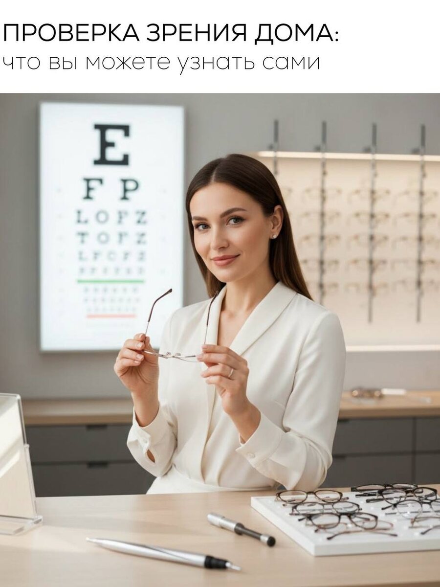 Проверка зрения в домашних условиях: что можно узнать самостоятельно. Многие замечают, что зрение стало хуже: буквы "плывут", глаза быстро устают, появляется головная боль. Возникает вопрос - можно ли проверить зрение дома? Частично да, но важно понимать: это лишь ориентир, а не медицинская диагностика. 1. Проверка по таблице. Можно распечатать таблицу Сивцева и повесить ее на стену. Отойдите на 5 метров и попробуйте прочитать строки по очереди, закрывая по одному глазу. Если 10-я строка видна нечетко или приходиться щуриться, это повод задуматься о профессиональной проверке. 2. Проверка зрения вблизи. Возьмите книгу или телефон и отведите текст на расстояние 30-40 см. Если мелкие буквы расплываются, появляется напряжение или желание отодвинуть текст дальше - возможны нарушения аккомодации или возрастные изменения. 3. Проверка зрения вдаль. Обратите внимание на вывески, номера машин, лица людей на расстоянии. Если контуры размыты, а детали сложно различить, это может быть призн