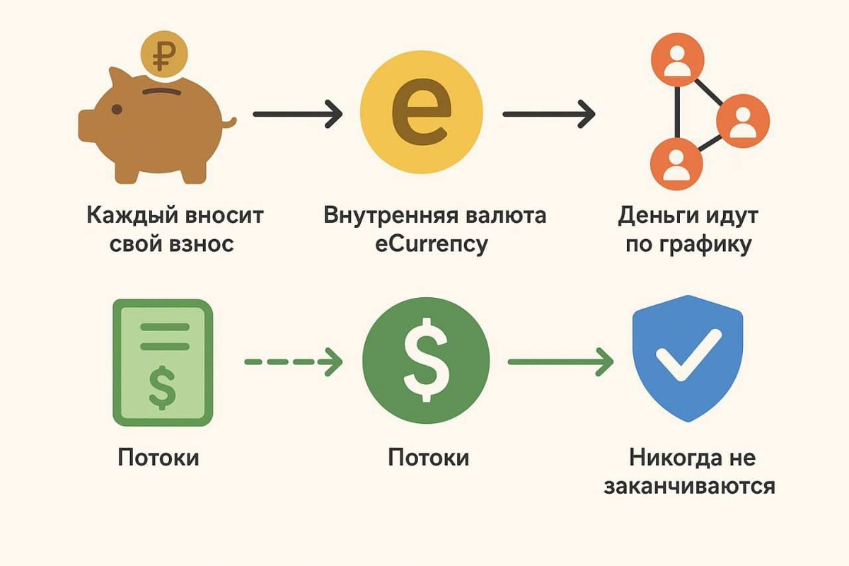 💸ОТКУДА ДЕНЬГИ В СООБЩЕСТВЕ? Деньги в «Меркурии» не берутся «из воздуха». Каждый, кто заходит, сначала кладёт свой взнос. Этот взнос и формирует кассу. Представь: у тебя дома есть копилка. Чтобы что-то взять из неё завтра - нужно сегодня сначала туда положить. Вот так же и здесь: никто не может получить выплату, пока не внёс в кассу заранее. ☄️ПОЧЕМУ НЕТ КАССОВОГО РАЗРЫВА? Разрыв бывает там, где деньги обещают сразу, а поступлений ещё нет. В «Меркурии» всё наоборот: Сначала деньги вносятся. Потом они распределяются по графику. То есть, когда человек приходит, касса уже наполнена предыдущими взносами. И его деньги - тоже часть будущих выплат для других. Система всегда идёт «на шаг вперёд». Поэтому дыры не образуются. 🟠ПОЧЕМУ ХВАТАЕТ ДЕНЕГ ДАЖЕ БЕЗ НОВЫХ ЛЮДЕЙ? Вот здесь секрет в eCurrency. Это не «просто монета», а внутренняя валюта, которая постоянно растёт в цене. Когда ты создаёшь поток, система подтягивает еКаренси по льготному курсу - выше рыночного. На этой разнице