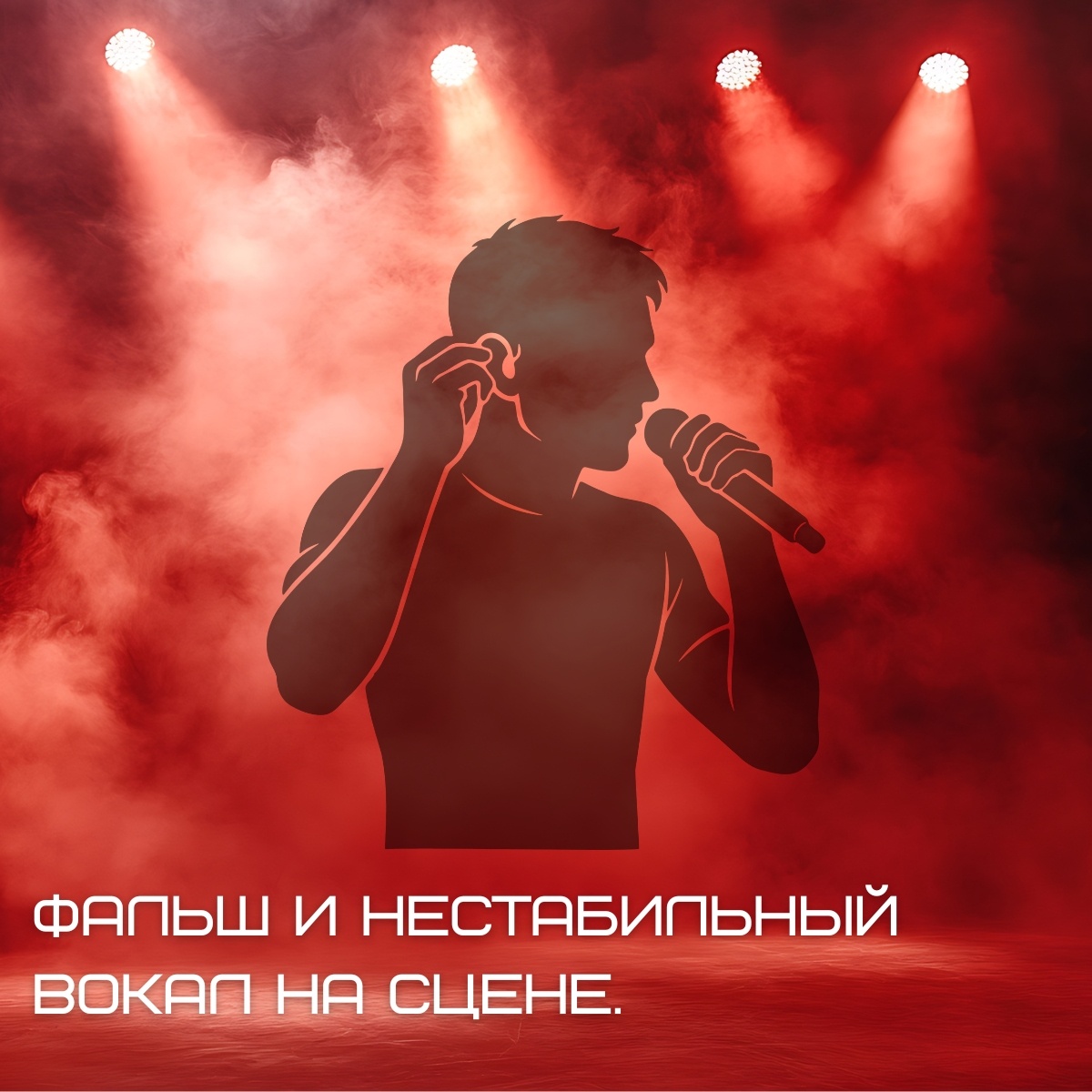 На сцене резко меняется слуховая обратная связь: громкий аккомпанемент, задержка мониторов, искажённый микс, отражения зала, доминирование костной проводимости. Из-за этого мозг плохо слышит собственный голос. Аудио-моторная петля теряет управляющий сигнал, коррекция баланса CT/TA запаздывает или выдаёт ошибки. Высота и тембр начинают «плавать».