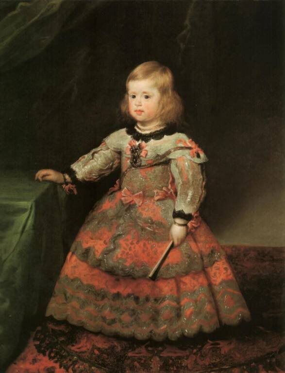 Маргарита Тереза – дочь испанского короля Филиппа IV – родилась 12 июля 1651 года в Мадриде, а умерла 12 марта 1673 года в Вене. За свою короткую жизнь (21 год), инфанта Маргарита была запечатлена на 10 портретах. Шесть из них написаны придворным художником Диего Веласкесом, для которого юная принцесса была «светлым лучиком». Первый портрет Маргариты был написан Веласкесом, когда инфанте было 2 года. Несмотря на юный возраст, на всех портретах руки Диего Веласкеса у Маргариты Терезы прослеживаются схожие черты лица. Маленькая девочка со светлыми волосами во «взрослом» платье смотрит на нас с полотна. «Инфанта Маргарита». Д. Веласкес (arthive.com) Следующий портрет уже подросшей принцессы был написан в 1656 году – девочке на тот момент было 5 лет. Его также называют «Портрет в белом платье». «Портрет в белом платье. Инфанта Маргарита». Д. Веласкес (artchive.ru) Еще один портрет пятилетней Маргариты – «Менины». За этой картиной закрепилось название «Фрейлины», ведь именно так с испанског