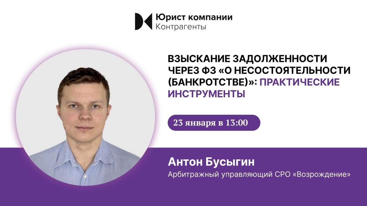 » 📅 Когда: 23 января в 13:00 по мск. Участие бесплатное, регистрация здесь. 🎙 Спикер: Антон Бусыгин, Арбитражный управляющий СРО «Возрождение». На вебинаре вы узнаете, как использовать Закон о банкротстве для эффективного взыскания долгов. Спикер расскажет про альтернативные подходы к возврату денежных средств, разъяснит практику судов и покажет, какие шаги реально ускоряют процесс получения взыскателями своих денежных средств. ➡️ Регистрируйтесь по ссылке, чтобы подключиться к прямому эфиру и после вебинара получить запись. 🟣 Подписаться на канал «Юрист компании» | 🇷🇺 «Юрист компании» в MAX