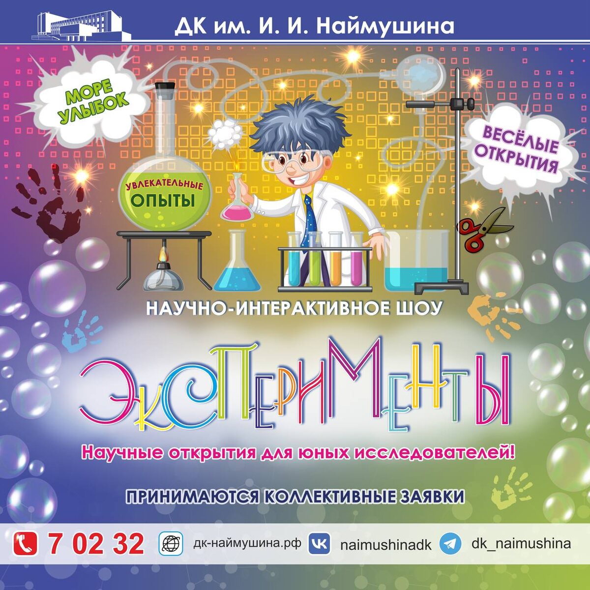 !🌟 Приглашаем любителей приключений вновь отправиться в увлекательный мир экспериментов! 🔍Узнай, как работает наука и взгляни на знакомые вещи по-новому! 🔬Что вас ждет? 🧪 Увлекательные опыты, весёлые открытия и море улыбок! 🌈 Участие в интуитивно понятных опытах! 🫧 Увлекательное шоу мыльных пузырей! 👨🔬 Шанс стать настоящим ученым на один день! 🚀Присоединяйся и наполни обыденный день феерией красок и открытий, ведь каждый эксперимент - это маленькое чудо, которое ждет своего открытия! Не упустите шанс ощутить себя настоящим ученым и получить массу положительных эмоций! 📆В феврале и марте 📍«ДК им. И. И. Наймушина» 🎟Принимаются коллективные заявки Тел. +79149596900, 7-02-32 Стоимость билета: 300