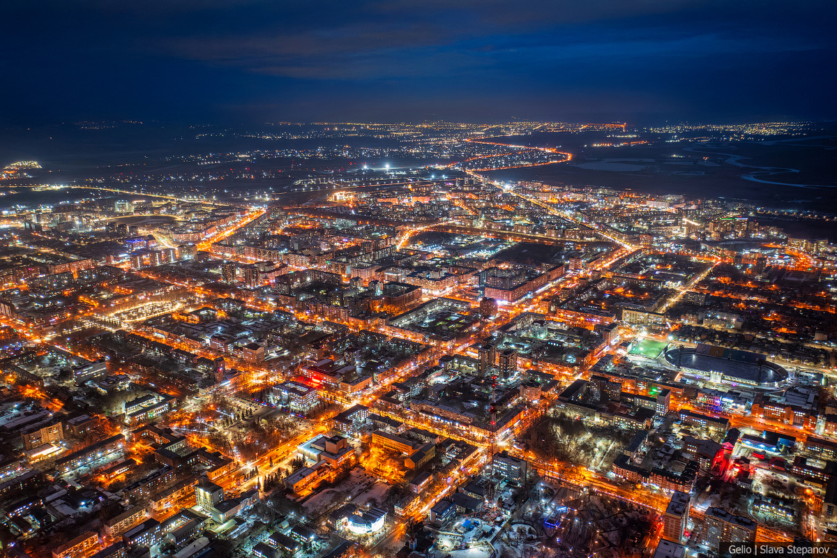 Город расположен в Южной Сибири, на слиянии рек Енисея и Абакана. Это столица Хакасии и второй в списке городов России в алфавитном порядке. Началось всё с острога, который построили в 1675 году. Со временем казачья крепость превратилась в село Усть-Абаканское, а с 1931 года Абакан официально считается городом. Сегодня здесь живёт 185 тысяч человек, а на фото вечернего Абакана видна чёткая планировка городских кварталов. 1. Первомайская площадь — центральная площадь Абакана. Сквер, памятник Ленину, здание Правительства республики, главные учебные заведения, драматический театр — всё находится вокруг площади. Здесь проводятся все главные городские и республиканские мероприятия. 2. Проспект Дружбы народов начинается со скульптуры Лора на въезде в город и заканчивается перекрёстком, на котором расположена гостиница «Дружба» — здание с тремя корпусами, которые расходятся от центра под углом 120 градусов. 3. Здание Правительства республики Хакасия. 4. Мемориальный комплекс Парк Победы. Доми