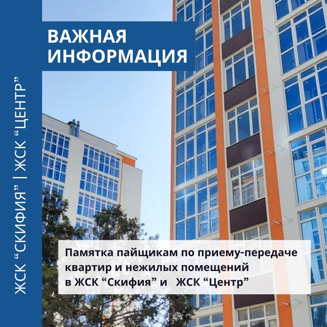⚡️ Чтобы этап приема-передачи квартир и нежилых помещений в ЖСК "Скифия" и "Центр" прошел быстро и понятно, мы подготовили памятку для вас. Сохраните и передайте информацию соседям! ➡️ В установленные даты каждому пайщику нужно будет приехать в Кооператив для приемки квартиры/нежилого помещения. График будет обязательно опубликован. Следите за новостями! ➡️ Приемка квартиры/нежилого помещения происходит в день осмотра с участием представителя Кооператива. Пайщик принимает квартиру/нежилое помещение по акту приема-передачи, который подписывается Кооперативом и пайщиком. ➡️ При осмотре квартиры/нежилого помещения устанавливается соответствие техническому состоянию, предусмотренному договором о членстве. ➡️ Если пайщик хочет провести осмотр с участием стороннего специалиста, нужно об этом письменно уведомить Кооператив за 3 рабочих дня до даты осмотра. При этом нужно приложить копии документов: ✅ которые подтверждают образование и квалификацию привлекаемого специалиста. А именно: